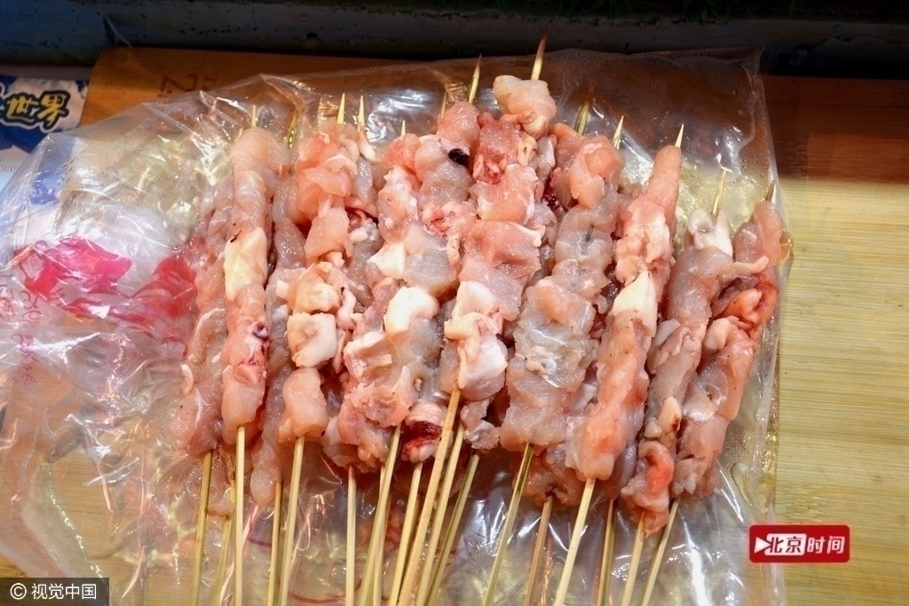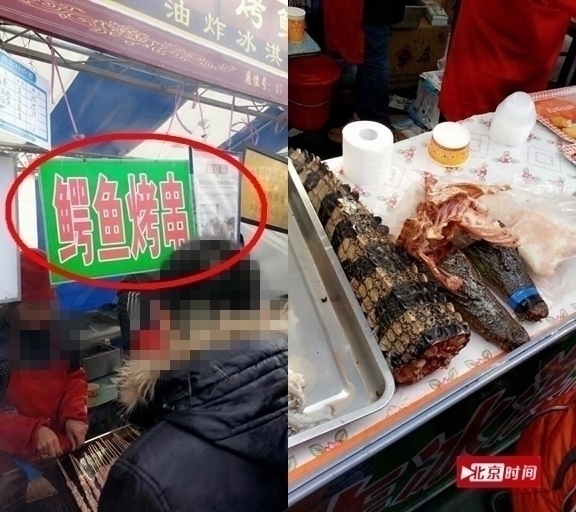 圖為2014年北京龍潭廟會上攤販售賣鱷魚烤串。