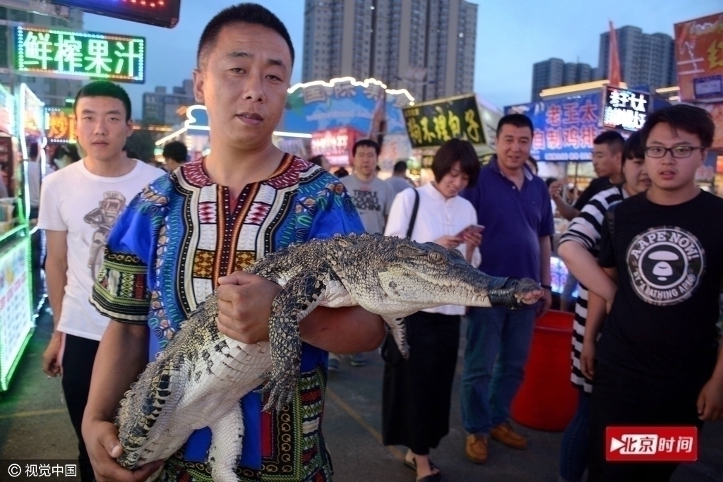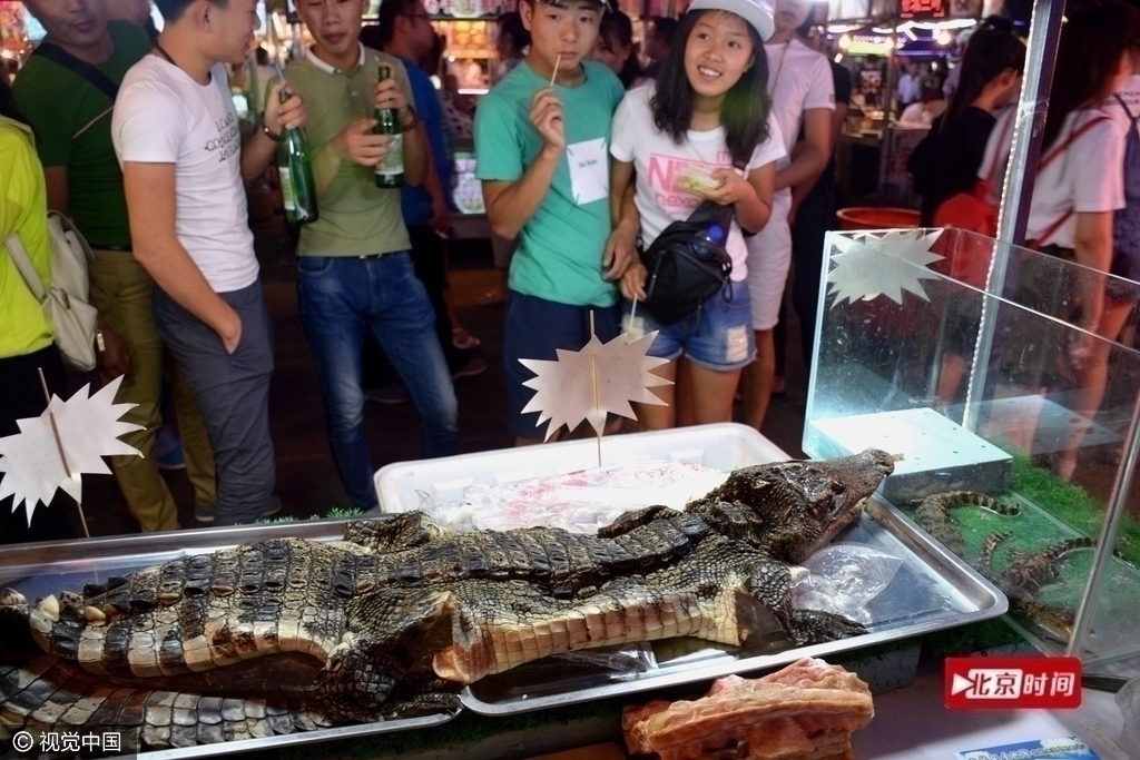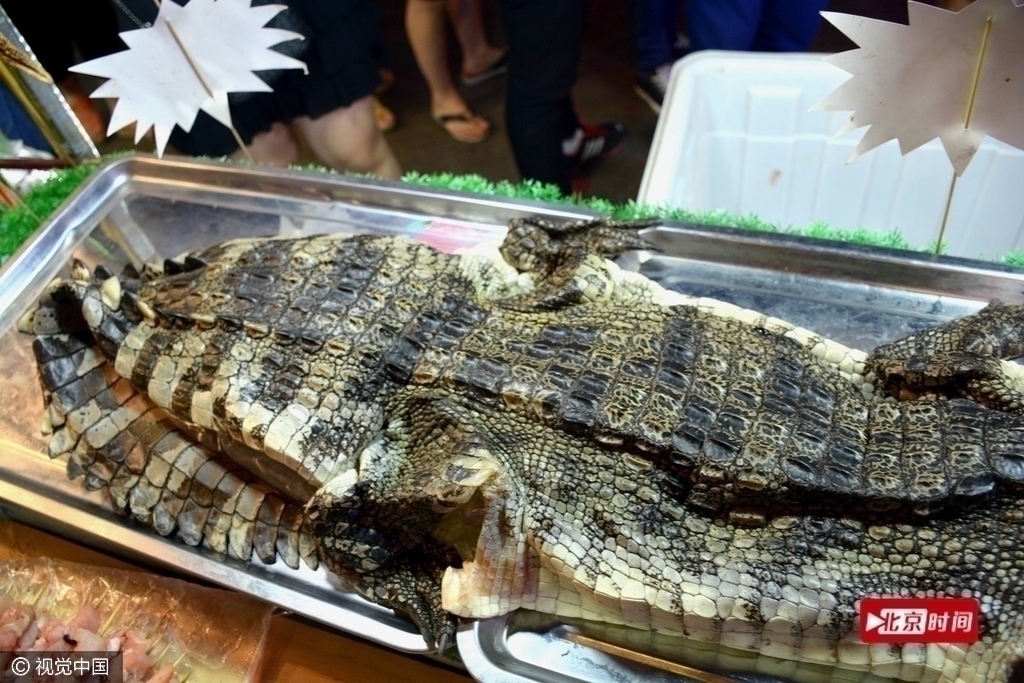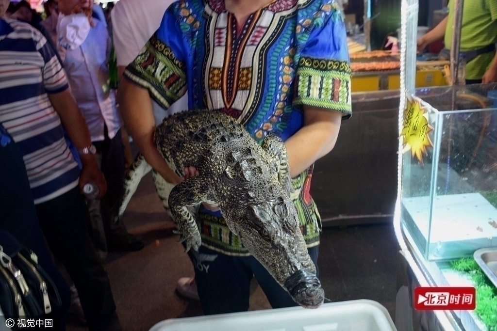 6月13日,遼寧瀋陽,兩條成年鱷魚被擺在一燒烤攤上,商販現場製作鱷魚肉烤燒,20元一串,張牙舞爪的鱷魚被端上餐桌,引來不少顧客圍觀。